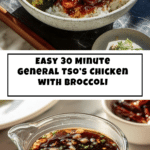 A quick and flavorful 30-minute General Tso’s Chicken recipe featuring tender baked chicken coated in a tangy, spicy sauce, paired with roasted broccoli. Perfect for a weeknight dinner, this dish offers a delicious balance of savory, sweet, and spicy flavors with a healthier twist by baking instead of frying.