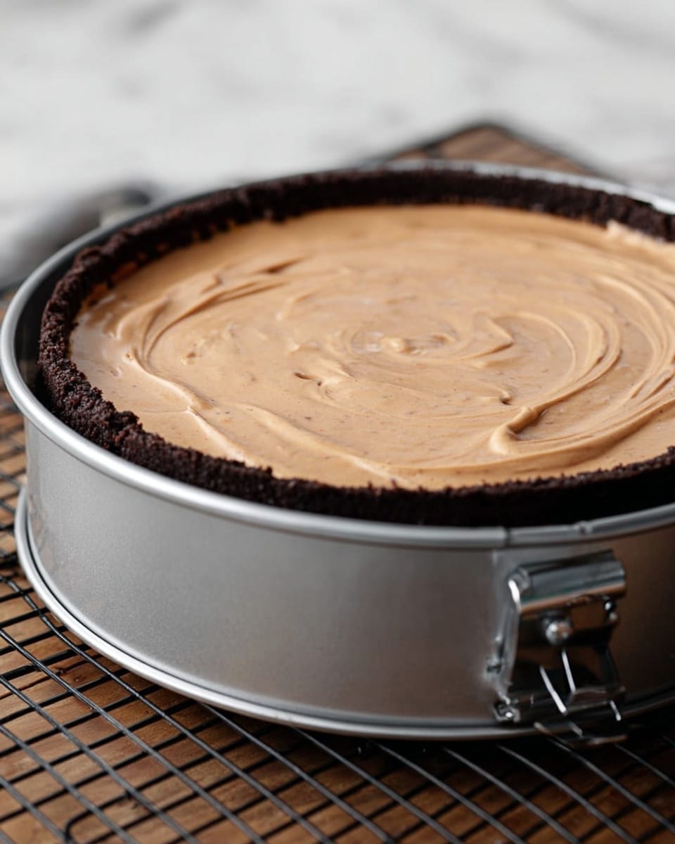 - To make the crust, I combine the Oreo crumbs with melted butter and press the mixture evenly into the bottom of the pan. I bake it for 10 minutes, then set it aside to cool.