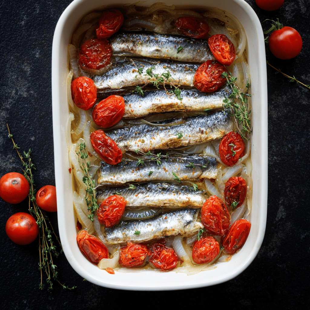 I adore this recipe because it brings out the rich flavor of sardines without masking them. The tomatoes and onions roast down into a savory, slightly sweet sauce. Garlic and thyme add aromatic depth. It’s effortless yet impressive, and I often serve it with crusty bread or a side salad to soak up the juices.