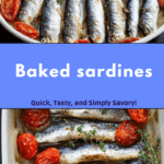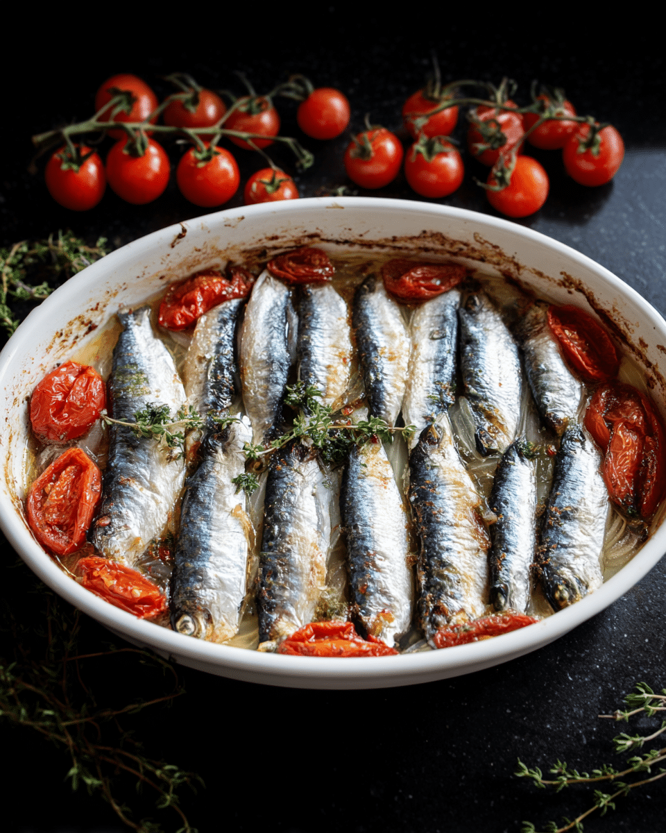 Baked Sardines is a Mediterranean-inspired dish featuring fresh sardines roasted with tomatoes, onions, garlic, olive oil, and lemon thyme. The vegetables caramelize into a savory sauce that complements the rich fish, making it both simple and flavorful.