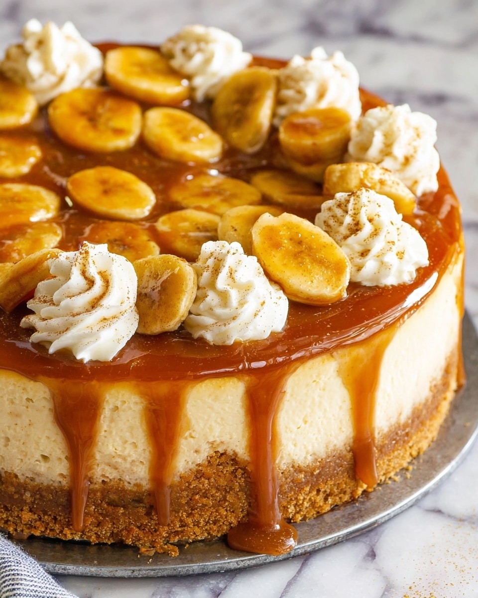 This Bananas Foster Cheesecake blends the creamy richness of classic cheesecake with the warm, buttery rum flavor of Bananas Foster, featuring a cinnamon vanilla wafer crust, banana-infused filling, and caramelized banana topping.