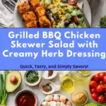 The magic of this BBQ Chicken Skewer Salad Recipe lies in its thoughtfully simple ingredients. Each one is essential — from the juicy chicken breasts that soak up the BBQ marinade to the fresh herbs that bring brightness and depth. The fresh vegetables add crunch and color, while the homemade herby ranch dressing ties everything together with creamy zest.