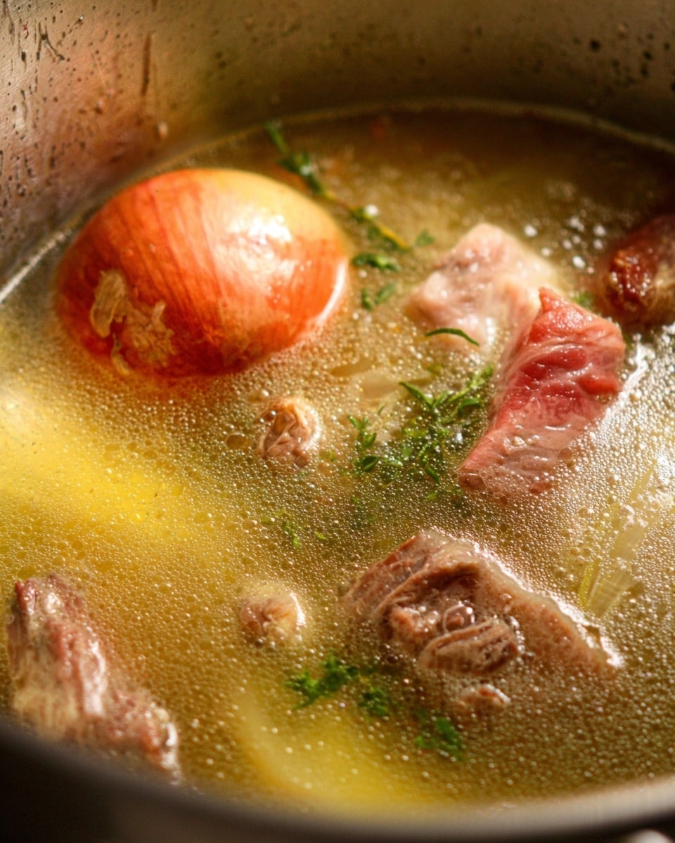 - I return the cleaned ribs to the pot with 10 cups of fresh water. I add the onion (with skin if organic), green onions, ginger slices, and optional green onion roots.