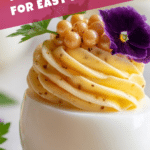 These Boursin Deviled Eggs are a creamy, flavorful twist on the classic appetizer, featuring a smooth filling made with Boursin garlic & herb cheese, spicy brown mustard, and mayonnaise. Topped with delicate pansy flowers and a hint of mustard caviar, they make a stunning and delicious party treat perfect for any occasion.