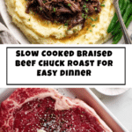 Take your chuck roast and use a paring knife to make a few small slits into both the top and bottom, then nestle the halved garlic cloves into these slits. This step ensures the garlic flavor permeates the beef deeply during cooking. Now, be generous with seasoning—rub about 2 tablespoons of kosher salt and 1 teaspoon of black pepper all over the roast. This flavorful crust is crucial for enhancing the beef’s natural richness.