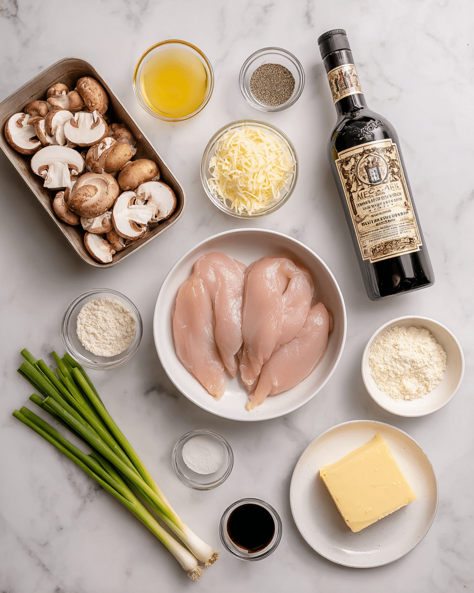 A rich and flavorful chicken dish with golden cutlets topped with sautéed mushrooms, a Marsala wine sauce, and melted mozzarella and Parmesan cheese — elegant enough for guests yet simple enough for a weeknight meal.