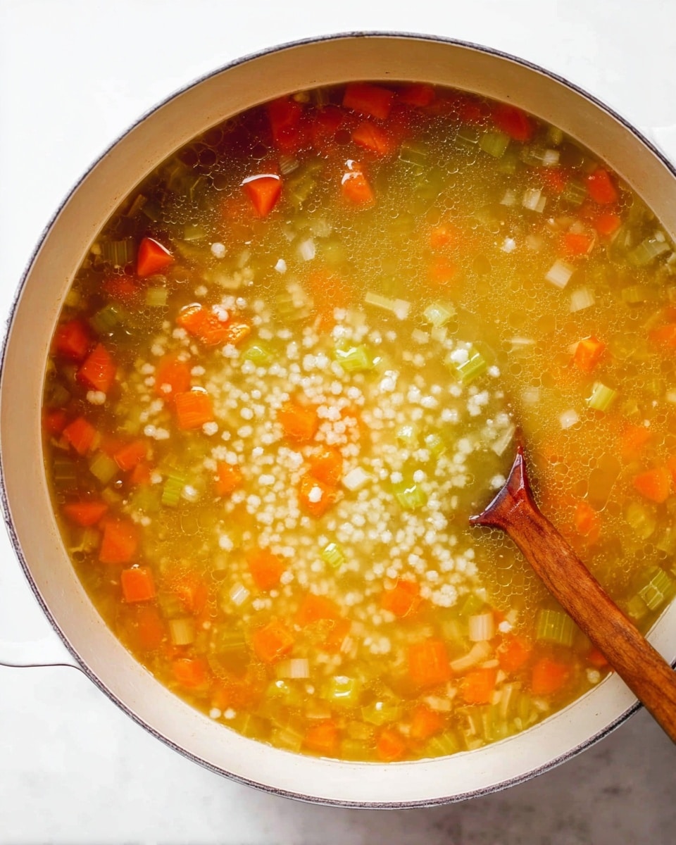 - Stir in pastina and cook 5–7 minutes, until pasta is tender.