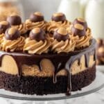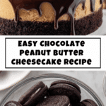 This Chocolate Peanut Butter Cheesecake features a rich Oreo crust, a silky smooth peanut butter cheesecake filling, and a glossy chocolate ganache topping—finished with creamy peanut butter frosting and buckeye candies for the ultimate indulgence.