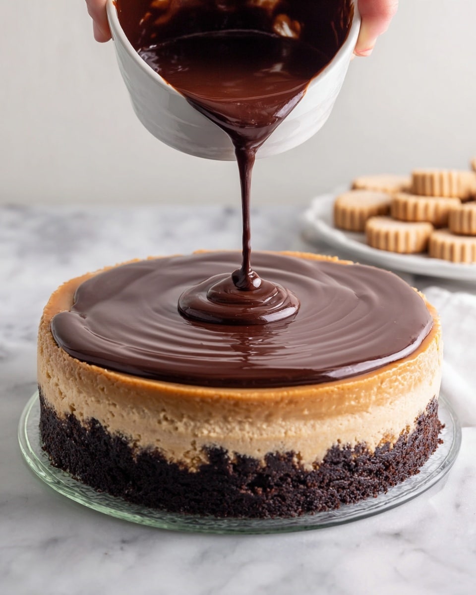- For ganache: heat cream until simmering, pour over chocolate chips, let sit 1 minute, then stir until smooth. Pour over chilled cheesecake and spread evenly.