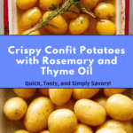 This recipe for Confit Potatoes with Thyme Oil features tender Pee Wee Dutch Yellow Idaho potatoes slowly cooked in extra virgin olive oil infused with fresh rosemary, resulting in rich, flavorful potatoes finished with a sprinkle of coarse sea salt. The confit method ensures a soft texture and a fragrant herbal aroma, making it an elegant yet simple side dish suitable for any special occasion or a comforting meal.