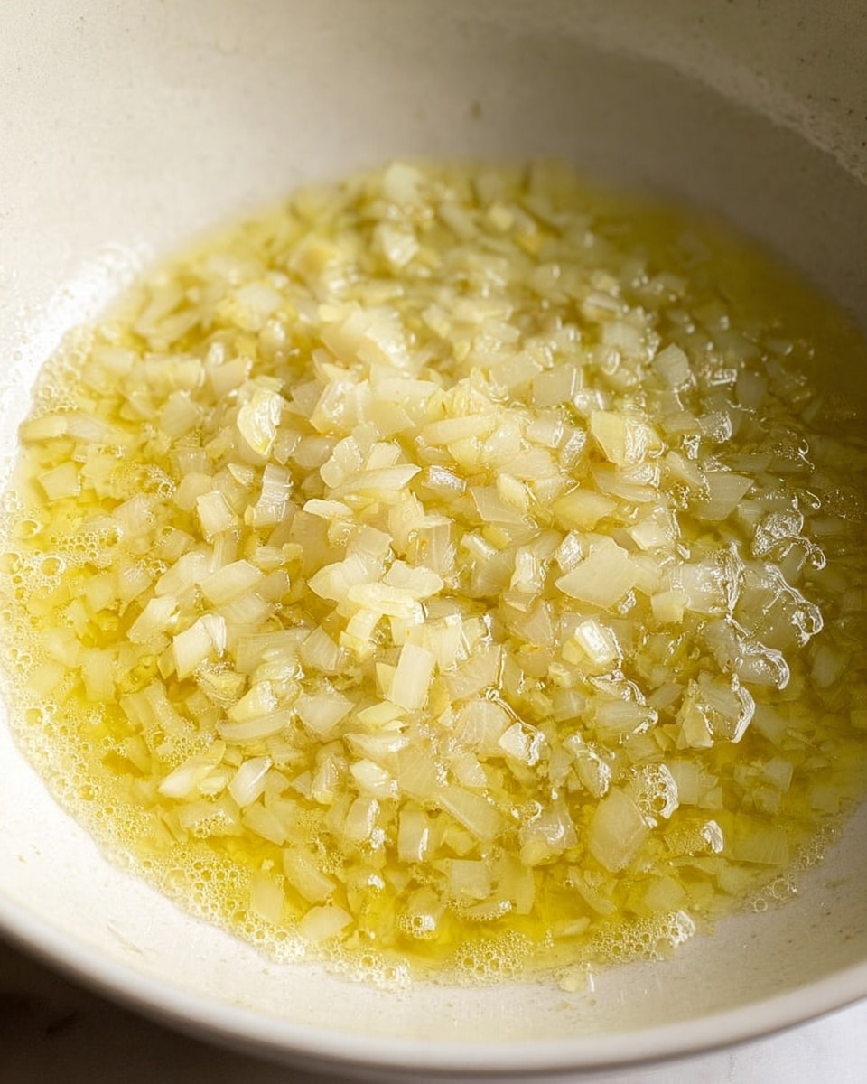 - Once melted, I add the finely diced onion and sauté for about 3–4 minutes until it becomes soft and translucent.