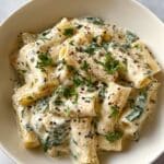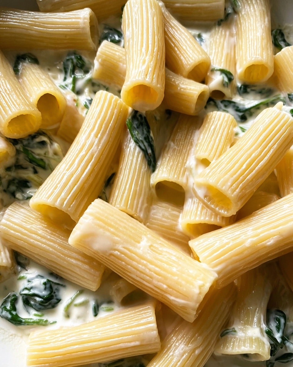 A rich and creamy spinach rigatoni dish featuring tender pasta, fresh spinach, and a velvety parmesan cream sauce. It’s comforting, elegant, and easy to make—perfect for both weeknights and special dinners.