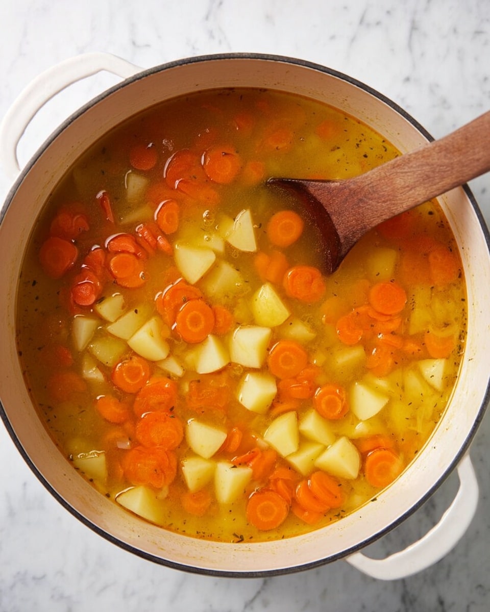 - Pour in the vegetable broth and bring the mixture to a boil. Once boiling, reduce the heat to low, cover, and let it simmer for about 15–20 minutes or until the carrots and potatoes are tender.