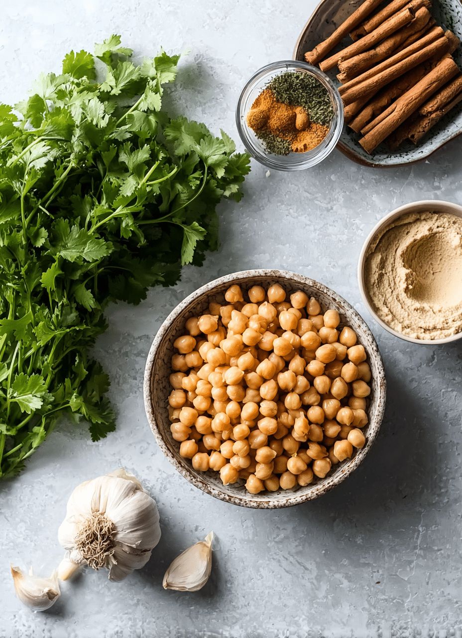- In a food processor, I combine chickpeas, parsley, cilantro, onion, garlic, cumin, coriander, salt, pepper, cayenne (if using), baking powder, flour, and lemon juice. I pulse until the mixture is combined but still slightly chunky.