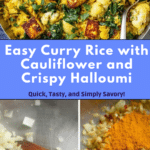 A delicious and vibrant Curry Rice with Cauliflower and Halloumi, featuring aromatic spices, tender cauliflower florets, and crispy pan-fried halloumi cheese. This one-pot dish combines the flavors of curry powder and turmeric with fresh spinach and herbs for a hearty and satisfying vegetarian meal.