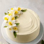 - Frost the cooled cake with the buttercream and decorate with edible daffodils, mint, or sanding sugar as desired.