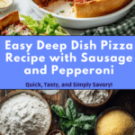 This Deep Dish Pizza recipe features a rich, buttery crust with a crispy cornmeal edge, layered with gooey mozzarella, Italian sausage, pepperoni, and a generous topping of pizza sauce. Baked in a skillet or cake pan, this hearty pizza is perfect for sharing and offers a deliciously comforting meal with a golden, melty cheese interior and a crisp, flavorful crust.