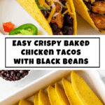 These Easy and Crispy Baked Chicken Tacos offer a quick and delicious meal using cooked rotisserie chicken for convenience. The tacos are filled with a flavorful mix of seasoned chicken, black beans, green chiles, and topped with Mexican cheese, fresh cherry tomatoes, jalapenos, and sour cream, all baked to crispy perfection in stand-up taco shells.