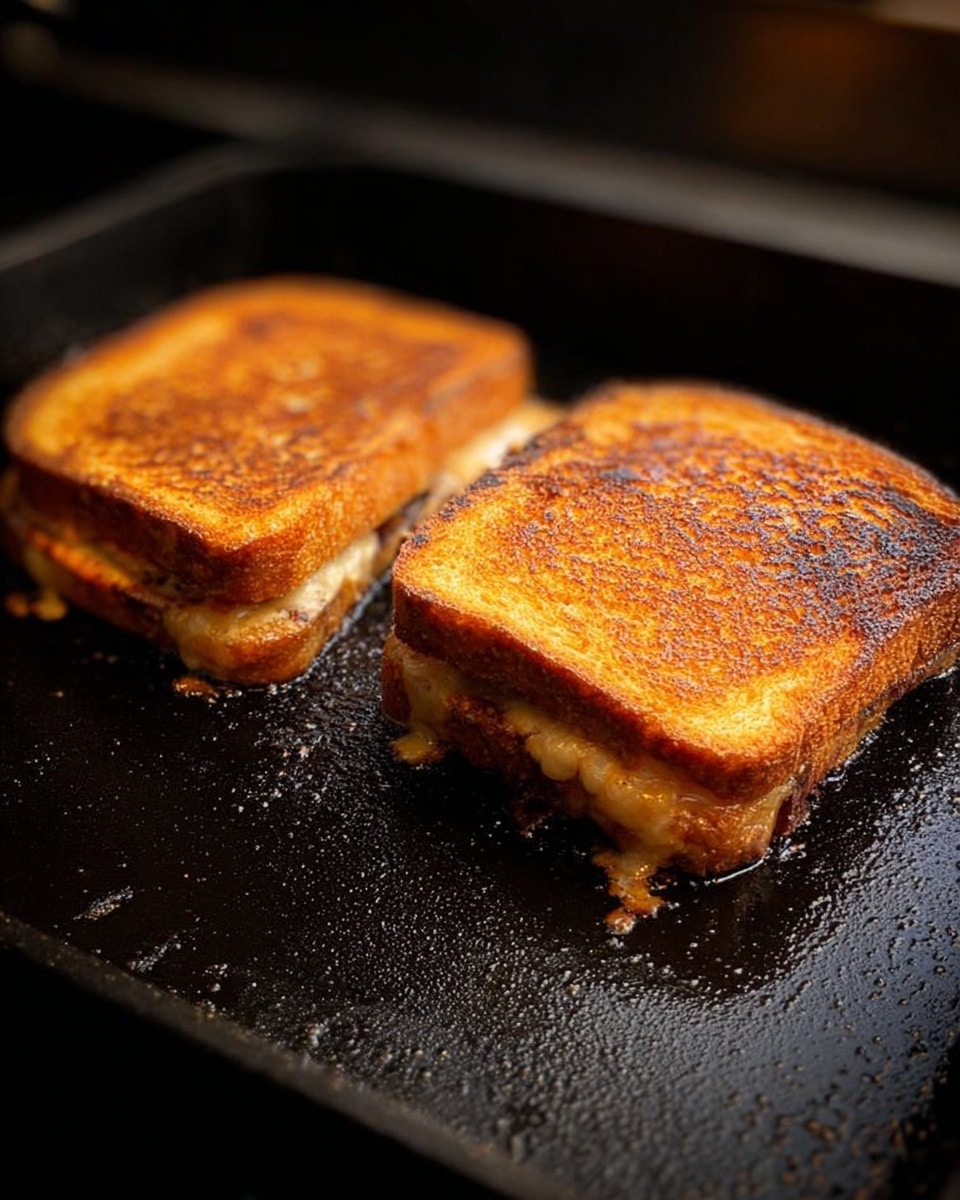 - Preheat a skillet or griddle over medium heat. Grill the sandwich for 3–4 minutes per side until golden brown and the cheese is melted, pressing gently with a spatula.