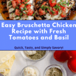This Easy Bruschetta Chicken recipe combines juicy, seasoned chicken breasts topped with fresh, vibrant bruschetta and melted mozzarella cheese. A quick and flavorful dish perfect for a weeknight dinner that brings the taste of Italian bruschetta to your plate with a protein-packed twist.