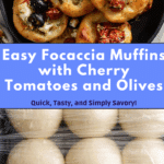 These easy focaccia muffins are a delicious and simple twist on traditional focaccia bread, made by topping frozen dinner rolls with classic Mediterranean ingredients like cherry tomatoes, olives, feta, and Parmesan, then drizzling with olive oil and seasoning with oregano and salt for a flavorful bite-sized treat.