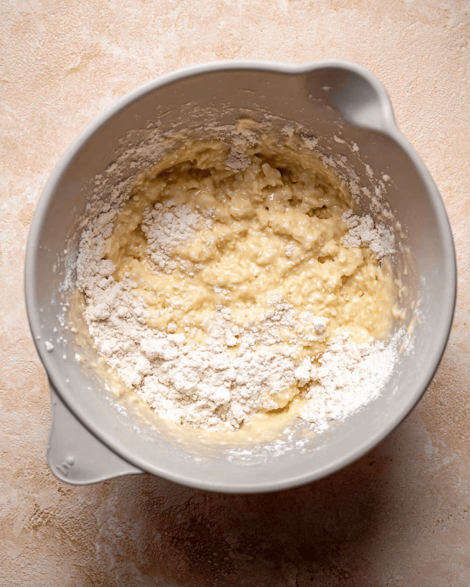 - I pour the wet ingredients into the dry ingredients and gently stir just until the batter comes together — I make sure not to overmix.