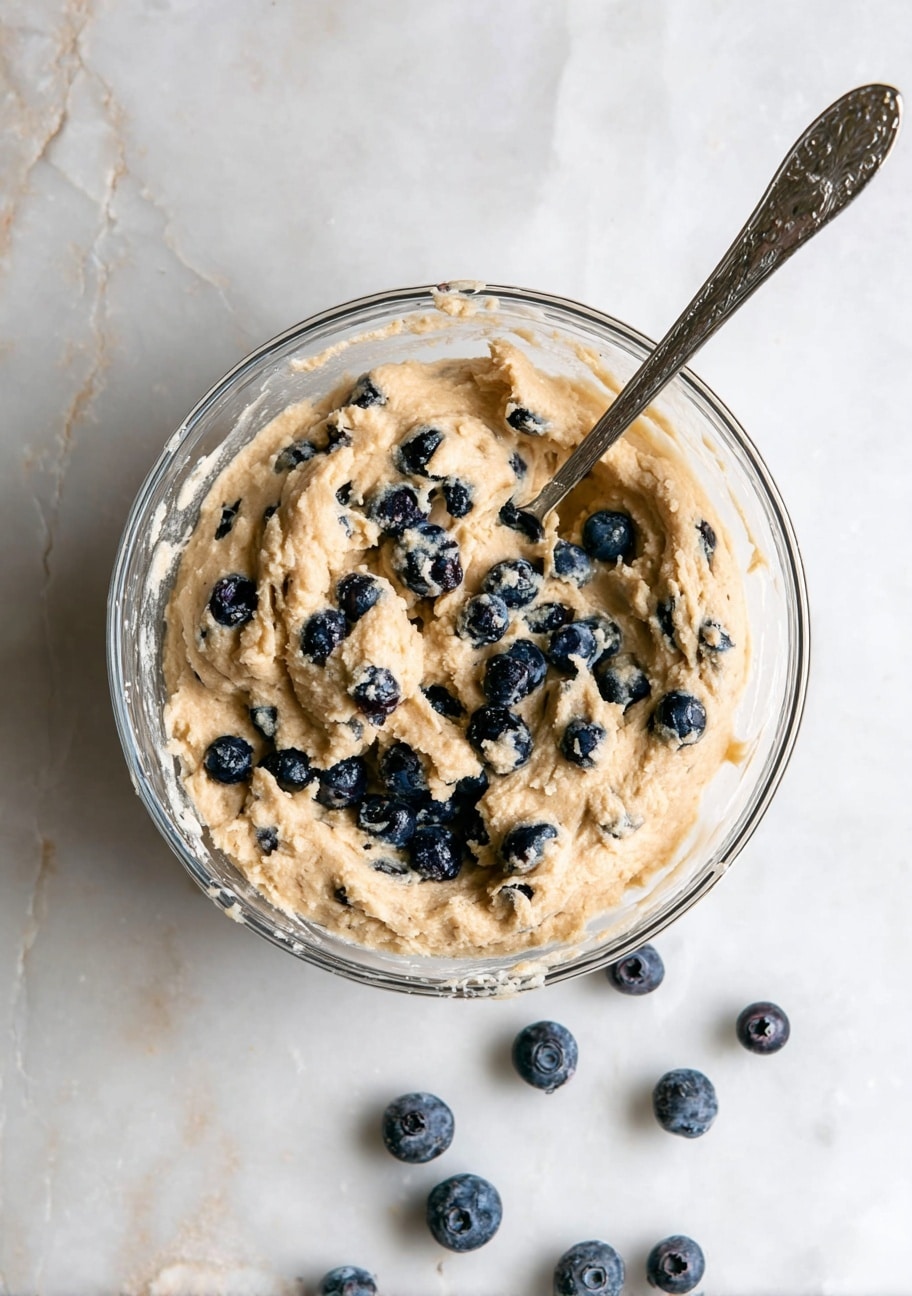 Toss blueberries lightly in flour before folding to prevent sinking.