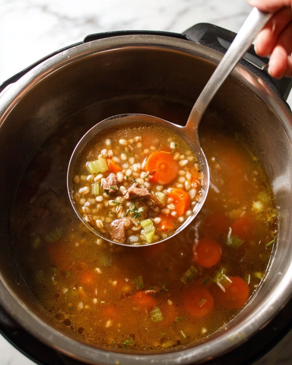 A hearty and comforting Instant Pot soup made with tender chunks of beef, wholesome vegetables, and chewy pearl barley in a rich, savoury broth. Perfect for cold nights and easy enough for weeknight cooking.
