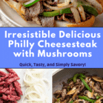 This irresistible Philly cheesesteak with mushrooms features tender slices of beef, melty provolone cheese, and sautéed onions, peppers, and mushrooms all piled into a toasted hoagie roll for the ultimate hearty sandwich experience.
