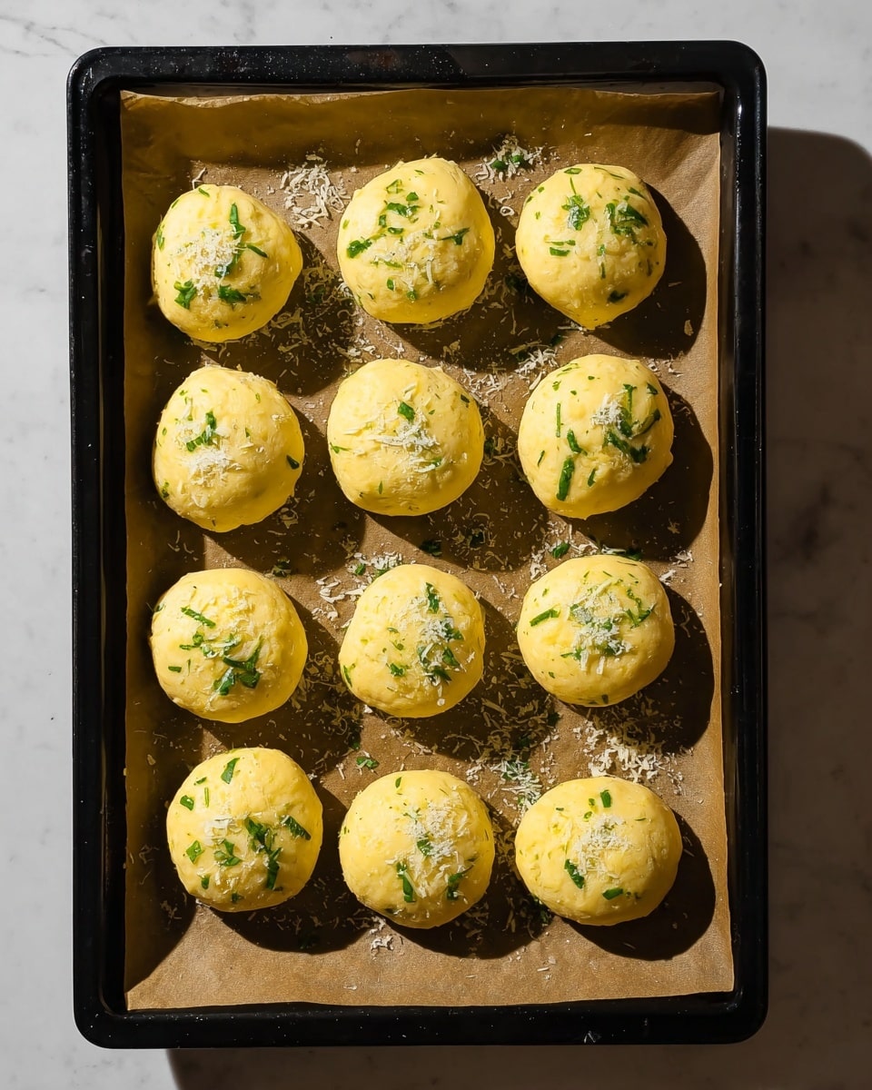 - Pinch edges together to seal and form a ball. Place seam-side down on the baking sheet.