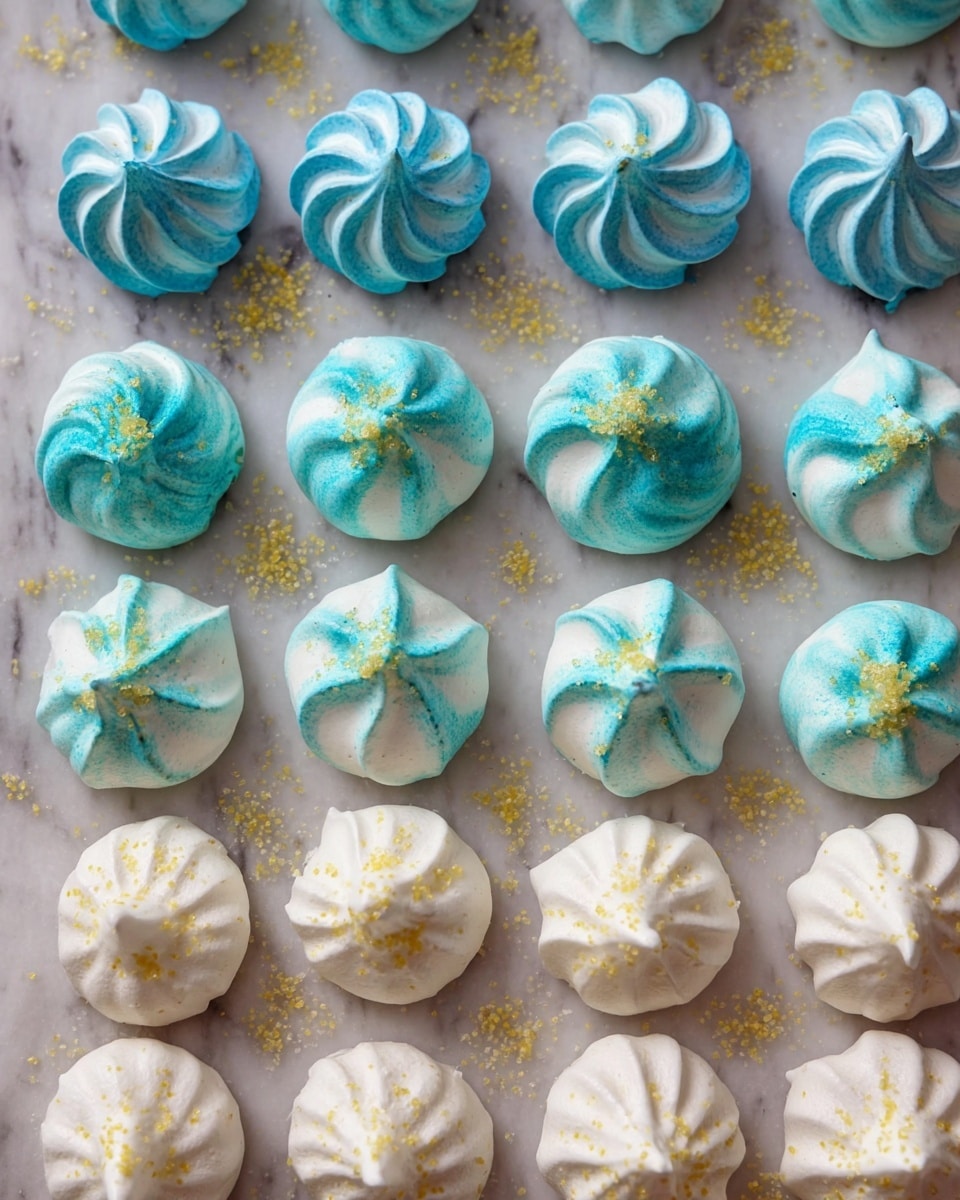 - For the buttercream rosettes, I beat butter until fluffy, then add powdered sugar, milk, and vanilla extract until smooth. I tint it with teal gel food color and pipe rosettes or kisses on top for decoration.