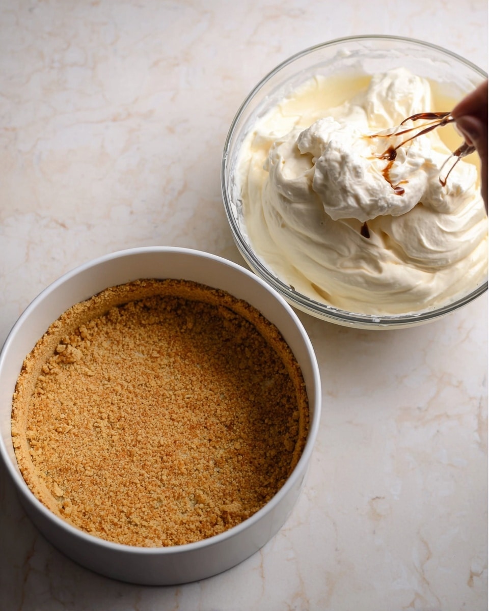 - Prepare the Crust: Preheat oven to 325°F (163°C). Mix graham cracker crumbs and sugar with melted butter until evenly moistened. Press into the bottom of a greased 9-inch springform pan. Bake for 10 minutes and let cool.