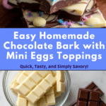 Delicious and easy-to-make chocolate bark featuring a blend of semi-sweet and white chocolate, topped with chopped Cadbury mini eggs and optional fun toppings like Peeps, M&Ms, and sprinkles. Perfect for a festive treat or a sweet snack, this bark sets quickly in the fridge and is simple to customize with your favorite toppings.