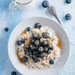 Creamy and wholesome overnight oats made with rolled oats, cinnamon, nut butter, blueberries, and a drizzle of honey or maple syrup. A simple make-ahead breakfast that’s nutritious, customizable, and ready to enjoy straight from the fridge.