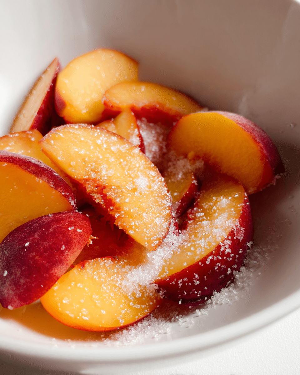 - Prepare the peaches: If using fresh peaches, peel and slice them; if using canned, drain well. In a small saucepan, combine peaches with sugar, cinnamon, and nutmeg. Heat over medium-low for 5–7 minutes until juicy and syrupy. Remove from heat and keep warm.