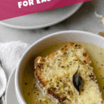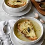Provençal Garlic Soup (Aïgo Boulido) is a rustic French soup from Provence made by simmering garlic, herbs, and olive oil into a fragrant broth, then enriching it with silky egg ribbons and topping it with toasted bread and melted Gruyère cheese. It’s simple, soothing, and deeply aromatic.