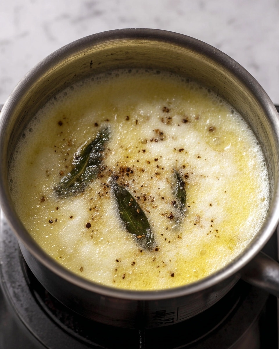- Add garlic cloves, sage leaves, and bay leaves, then reduce heat to low.