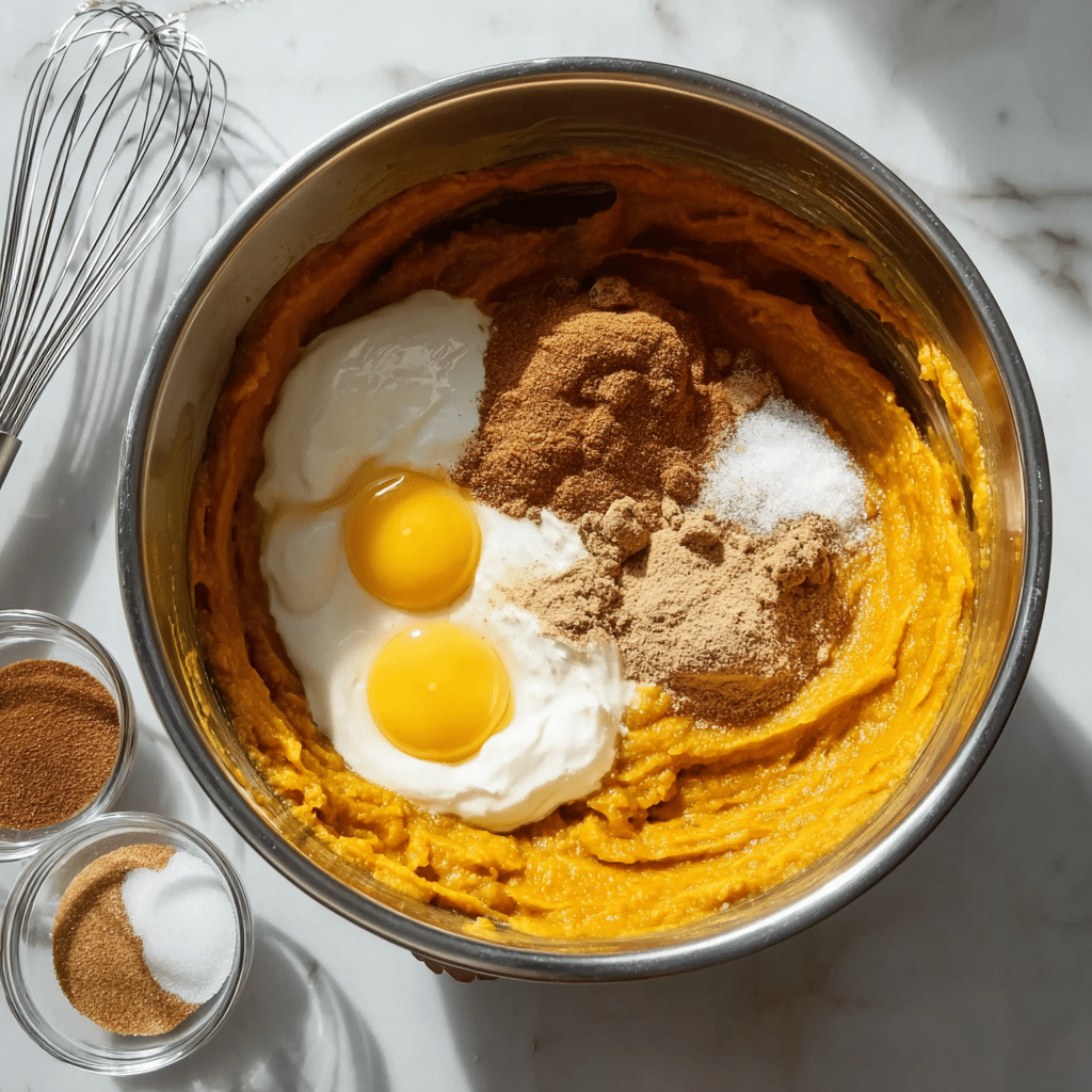 - In a large bowl, whisk pumpkin puree, brown sugar, eggs, heavy cream, cinnamon, ginger, cloves, nutmeg, salt, and vanilla until smooth.