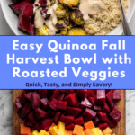 A vibrant and nutritious Quinoa Fall Harvest Bowl featuring roasted seasonal vegetables, crispy chickpeas, and a creamy balsamic tahini dressing. This wholesome dish combines warm flavors of roasted Brussels sprouts, sweet potatoes, beets, and shallots with protein-rich quinoa and chickpeas, perfect for a healthy, comforting meal.