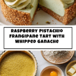 A luscious Raspberry & Pistachio Frangipane Tart featuring a delicate pistachio crust filled with a creamy pistachio frangipane layered over vibrant raspberry jam and fresh raspberries, topped with a silky whipped pistachio white chocolate ganache. This elegant tart balances nutty flavors and tart sweetness for a perfect dessert centerpiece.