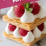 Now for the fun part: layering! Place one puff pastry piece on your serving plate, pipe or spoon a generous dollop of vanilla whipped cream on top, then add a few fresh raspberries. Follow with another pastry layer, cream, and raspberries, building up two or three layers total. Finish with a final pastry piece and a small swirl of whipped cream topped with a single raspberry for that picture-perfect look.