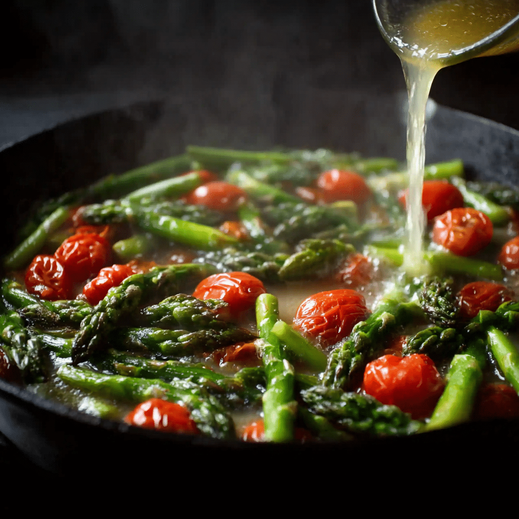 - I add the halved tomatoes and asparagus pieces, seasoning with salt, black pepper, and red pepper flakes (if using). I sauté for 4–6 minutes until the asparagus is tender-crisp and the tomatoes start to soften.