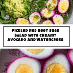A vibrant and tangy Red Beet Eggs Salad featuring pickled eggs infused with beet and spice flavors, paired with creamy avocado and fresh watercress, for a colorful and refreshing dish perfect as a light lunch or appetizer.