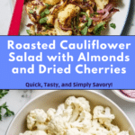 A vibrant, flavorful Roasted Cauliflower Salad that combines tender roasted cauliflower with tangy red wine vinegar, crunchy almonds and seeds, sweet dried cherries, and a hint of heat from serrano pepper, all tossed together with fresh parsley for a refreshing and satisfying dish.
