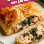 Spoon an even amount of the spinach and cream cheese filling over each salmon fillet, spreading it gently but evenly. Then fold the corners of the puff pastry up over the salmon, sealing the edges carefully by pressing them together. You can use a little beaten egg as glue if needed. Place the wrapped salmon seam-side down on a baking sheet lined with parchment paper.