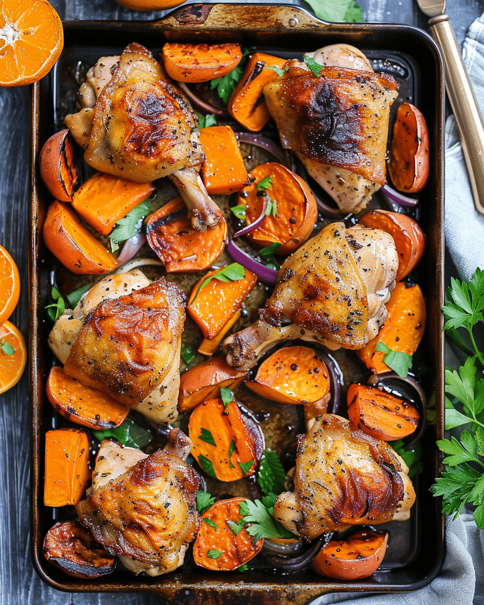 Sheet Pan Chicken Thighs and Sweet Potato is a vibrant, flavorful, and easy-to-make one-pan dinner. Juicy chicken thighs roast alongside sweet potatoes, bell peppers, red onion, and bright clementine slices, all coated in a warm, spiced marinade.