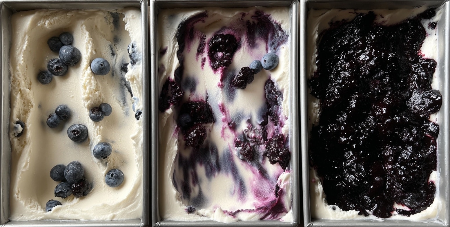 - I repeat with the remaining ice cream base and blueberry sauce, creating layers and swirls.