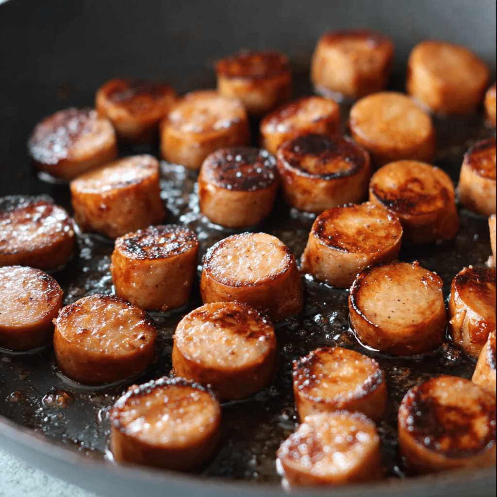 - In a large skillet over medium heat, I melt the butter and add the sliced sausage. I cook it until it’s browned on both sides and slightly crispy around the edges.