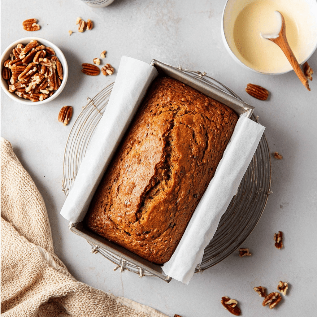 - Once the bread has cooled completely, I drizzle the glaze over the top and sprinkle with extra chopped pecans.