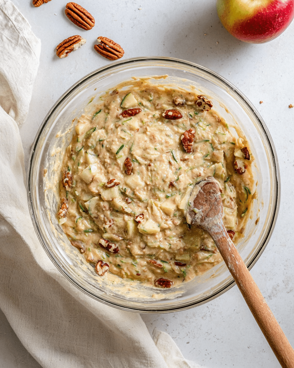- I fold in the chopped apple and nuts, making sure not to overmix.